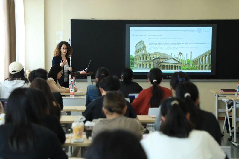 Valeria教授以时间为轴,带领师生从古罗马万神殿、高架水渠等工程与美学的融合,走至文艺复兴与巴洛克的空间创造,再到现代与当代的人本设计实践,介绍帕拉迪奥别墅的比例与和谐、伦佐·皮亚诺的人文建筑,以及米兰“垂直森林”等可持续案例。她还分享了意大利在文化遗产数字化与智慧街区方面的探索,展示建筑与科技、生态、社会包容的协同路径。